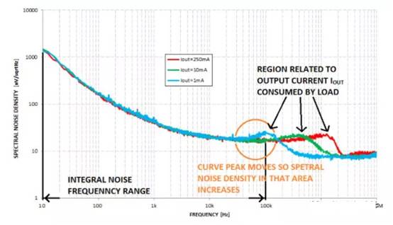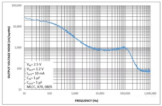 那么,我們?nèi)绾螠y(cè)量噪聲呢?如前所述,內(nèi)部噪聲是由輸入端有理想源的LDO產(chǎn)生的噪聲。在實(shí)際測(cè)量中,這個(gè)理想的源可能是電池,它比LDO穩(wěn)壓器具有更低的內(nèi)部噪聲。這種噪聲與頻率有關(guān),它由一個(gè)參數(shù)表示,如頻譜噪聲密度曲線或積分噪聲值(在通常為10 Hz至100 kHz的特定頻率范圍內(nèi),輸出噪聲電壓以微伏- uVRMS表示)。