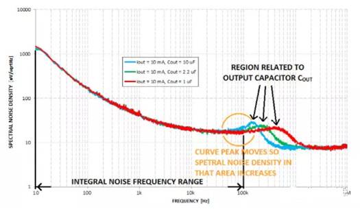 LDO輸出端的噪聲也與負(fù)載有關(guān)。負(fù)載消耗電流Iout,該電流值等于電阻 RLOAD。與負(fù)載相關(guān)的是多個(gè)RLOAD和輸出電容COUT。較高的RLOAD值或較高的 COUT值意味著與負(fù)載相關(guān)的曲線部分向較低頻率移動(dòng)。在上面的圖片中,您可以看到與IOUT有關(guān);在下面的圖片中,您可看到與COUT有關(guān)。