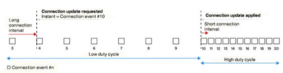 更改連接間隔會(huì)引入延遲。實(shí)際上,當(dāng)設(shè)備想要更改連接間隔時(shí),至少需要六個(gè)連接事件來(lái)協(xié)商該更改,如圖 1 所示。