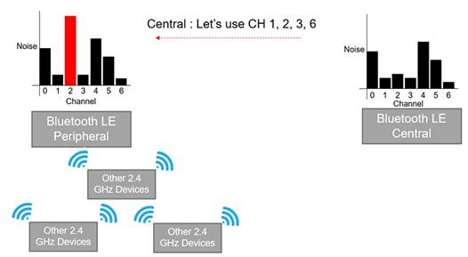 以前,中央設(shè)備自己決定頻道映射。如圖 4 所示,它將掃描 2.4 GHz 頻段中的不同信道,以告知哪些信道可用于流量。流量較多的信道將被排除,以降低數(shù)據(jù)包沖突的可能性。