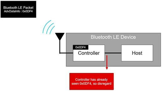 使用周期性廣告的BLE設(shè)備通常會(huì)多次發(fā)送信息,以增加傳輸?shù)亩鄻有圆⑻岣邟呙柙O(shè)備正確解碼的可能性。因此,偵聽(tīng)器設(shè)備可能會(huì)接收到同一分組的多個(gè)副本,并且會(huì)浪費(fèi)功率多次解碼同一信息。