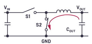 雖然簡單電壓轉(zhuǎn)換器可以從輸入電壓生成固定的輸出電壓,但在某些應(yīng)用中,這種特性是不夠的。一個(gè)例子是控制與電容相連的電壓節(jié)點(diǎn),這些電容可以充電至任何電壓。如果需要降低其電壓,則其必須部分放電。因此,在這樣的應(yīng)用中,電源必須能夠根據(jù)需要提供或吸收電流。這種轉(zhuǎn)換器稱為四象限D(zhuǎn)C-DC轉(zhuǎn)換器。對(duì)于這樣的應(yīng)用,可以使用具有輸出放電功能的電源。它可以讓輸出電容快速放電。圖1顯示了降壓型開關(guān)穩(wěn)壓器的這種功能。這里,在降壓轉(zhuǎn)換器關(guān)閉之后,開關(guān)S2長時(shí)間接通,輸出電容被放電。