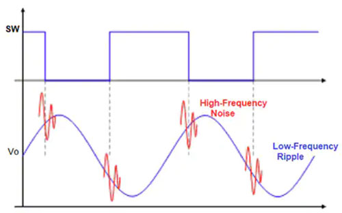最容易觀察到的噪音,也是能直接影響電路性能的噪音就是開關頻率下的紋波。這種紋波通常在 10 - 20 mV 的范圍內(圖 1 )。雖然這種紋波在本質上不是隨機的,但仍然是一種會造成系統(tǒng)性能影響的噪音表現(xiàn)。這種紋波的毫伏水平對于工作電壓為 5 V 伏及以上的高電壓數(shù)字集成電路來說通常不會帶來任何問題,但對于工作電壓低于 3 V 的低電壓數(shù)字電路來說,就是一個不可忽略的問題。電源軌上的波紋也是精密模擬電路和元件的一個主要問題,這就是為什么這類設備的電源抑制比 (PSRR) 規(guī)格至關重要。