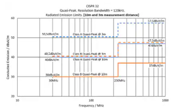 圖 2:這是 CISPR 32/EN 55032 提供的眾多圖表之一,它定義了各類消費產品的發(fā)射限制與頻率的關系。(圖片來源:Academy of EMC,《EMC 標準》)