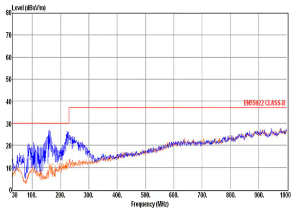 圖 9:MPM3833C DC/DC 模塊的數(shù)據表顯示,該器件很容易滿足 EN55022 B 類標準的輻射排放要求。(圖片來源:Monolithic Power Systems)
