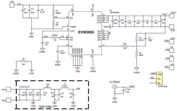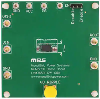 圖 12:使用 EVM3650-QW-00A 評估板,有意向的 MPM3650 DC/DC 模塊用戶可以快速評估其在應用中的性能。(圖片來源:Monolithic Power Systems)