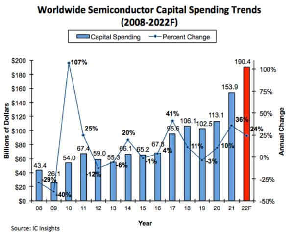IC Insight表示2022年半導體行業(yè)資本支出將持續(xù)保持高增長