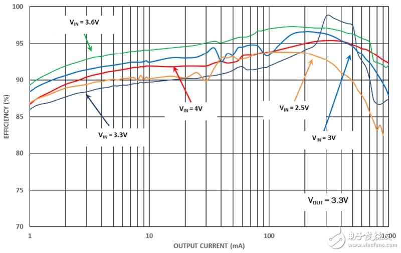 首先,我們將討論升壓-降壓穩(wěn)壓器如何為可穿戴系統(tǒng)增加價值。對于需要約3.3V~3.6V輸入電壓的應(yīng)用,升壓-降壓穩(wěn)壓器可高效地使用電壓范圍為4.375V~2.5V的廣泛新型化學(xué)電池。升壓-降壓穩(wěn)壓器在電池電壓(Vbat)為2.5V~3V時處于純升壓模式,然后在Vin≥3V和<3.9V時處于升壓-降壓模式,最后在Vbat =3.9V-4.5V時處于純降壓模式。