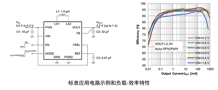 -在升降壓電源IC中消耗電流達(dá)到業(yè)界先進(jìn)的2.8µA Typ(VIN=3.6V、 Auto-PFM/PWM、無(wú)負(fù)載)