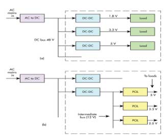 中間總線布置如圖1b所示。交流電源的主直流配電總線連接到每個主要子系統(tǒng)或產(chǎn)生中間總線的印刷電路板(PCB)中的DC-DC轉(zhuǎn)換器。從那里,POL DC-DC轉(zhuǎn)換器接管,為負載創(chuàng)建單獨的電源電壓。