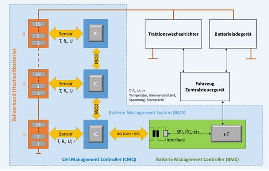 作為核心組件,電池管理系統(tǒng) (BMS) 負(fù)責(zé)電池的正確管理和監(jiān)測(cè)。目前,電動(dòng)汽車(chē)采用鋰離子電池。這些電池連接在一起使電池組達(dá)到所需總電壓,F(xiàn)有單體電池電壓約為3.6 V至3.7 V,動(dòng)力電池520 V或900 V高壓系統(tǒng)需要約140至250節(jié)電池。這種配置中,必須監(jiān)測(cè)電池的溫度、阻抗(電池內(nèi)阻)、電壓以及充放電電流。