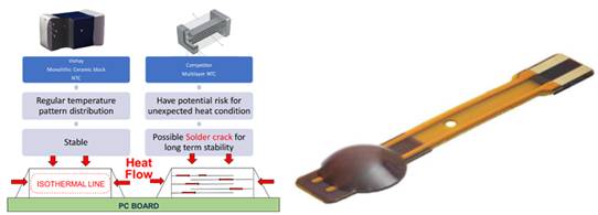 圖3 – NTC參考設(shè)計(jì)、技術(shù)性能對(duì)比以及NTCAFLEX05系列柔性箔傳感器參考設(shè)計(jì);圖片來(lái)源:Vishay