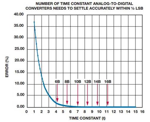 通過描繪歐拉數(shù)或eτ,可以繪出一條曲線,以便每次通過常數(shù)都能方便地看出相對(duì)誤差。如圖1可見,12位ADC樣本建立至大約1 LSB以內(nèi)需時(shí)8.4個(gè)時(shí)間常數(shù)。