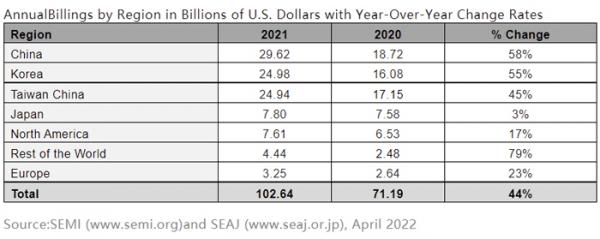 國際半導(dǎo)體產(chǎn)業(yè)協(xié)會SEMI發(fā)布《全球半導(dǎo)體設(shè)備市場統(tǒng)計報告》(Worldwide Semiconductor Equipment MarketStatistics (WWSEMS) Report)指出,2021年全球半導(dǎo)體制造設(shè)備銷售額激增,相比2020年的712億美元增長了44%,達(dá)到1026億美元的歷史新高。其中,中國大陸地區(qū)再度成為全球最大的半導(dǎo)體設(shè)備市場。