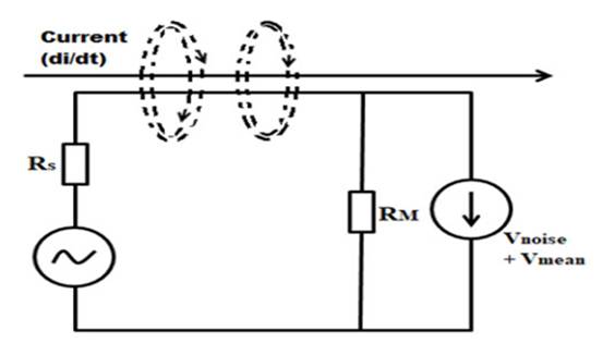 電路中快速的電流變化除了正常的電壓輸出(Vmeas)外,還會(huì)產(chǎn)生一個(gè)噪聲電壓(Vnoise)。耦合機(jī)制類似于變壓器的操作,因此Vnoise由等式給出;