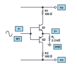 kHz正弦波,峰峰值幅度約為6 V,偏移為0。使用示波器通道1觀察W1的輸入,使用示波器通道2觀察放大器在RL處的輸出。