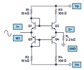 Q3提供。電阻R1和R2提供偏置電流,并設(shè)置流入輸出器件Q2和Q4中的空閑電流。