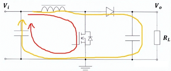 下面是Boost升壓DC/DC電路電流環(huán)路的情況,來聊聊電感底部敷銅對電源設計的影響。