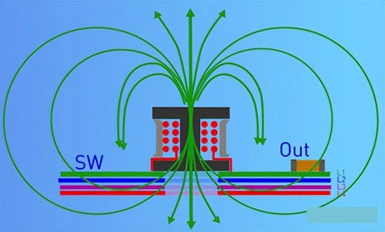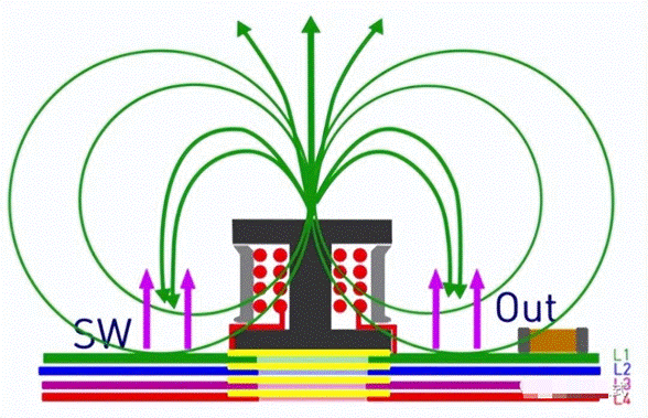 當Boost升壓正常工作時,電感中流過負載電流,形成回路。由于開關管的存在,電流是動態(tài)變化的,由此可形成電感的磁感線,在導體的表面部分磁感線回形成封閉的磁回路,部分磁路會形成漏磁溢出到空氣中。如果電感底部沒有敷銅時,從電感中溢出的磁感線會在整個電源系統(tǒng)中存在,使系統(tǒng)沒有相對安靜的空間,會造成EMI的性能下降。