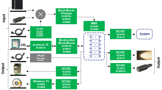 便攜式儲(chǔ)能電源的系統(tǒng)架構(gòu),與我們常見的充電寶較為類似,但輸入輸出功率更大、功能更多,對(duì)安全性、可靠性的要求也更高。下圖為便攜式儲(chǔ)能系統(tǒng)的內(nèi)部功能架構(gòu)圖,其中綠色部分為南芯半導(dǎo)體可提供的芯片方案。