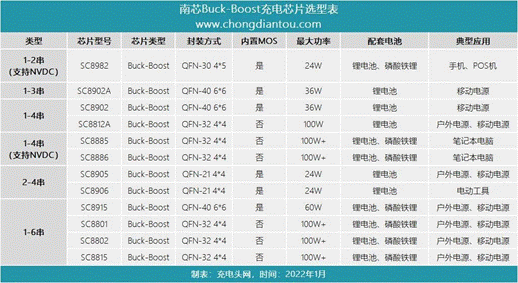 南芯升降壓芯片按照電池?cái)?shù)量可以分為1-2串、1-3串、1-4串、2-4串、1-6串等多種類型,從內(nèi)置MOS支持24W輸出的單芯片到外掛MOS支持100W以上的雙向快充控制器均有布局;并且很多款芯片不僅支持鋰離子電池,而且還支持磷酸鐵鋰電池,既能滿足當(dāng)下20-100W快充移動(dòng)電源的開發(fā),也能夠讓戶外電源實(shí)現(xiàn)大功率雙向快充,增加產(chǎn)品賣點(diǎn)。南芯Buck-Boost芯片可適用于多種場(chǎng)景,如:車載充電、快充移動(dòng)電源、USB