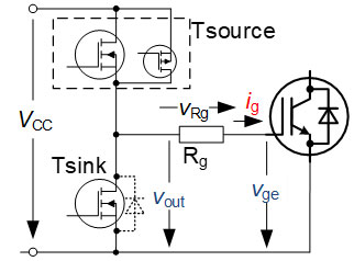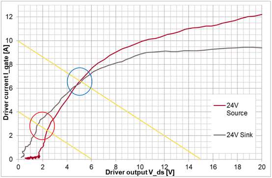 由此可見,單純地給出一個(gè)驅(qū)動(dòng)電流值是無法直接判斷帶載能力的。我們需要更多的信息,比如芯片內(nèi)部末級(jí)輸出形式、定義值的點(diǎn)在哪?更為重要的是,功率器件的門極電阻影響極大。如果外部電阻很大的話,會(huì)分掉更多的壓降,體現(xiàn)在圖7的電阻斜率更小,使得工作點(diǎn)左移,更近原點(diǎn)。如果這時(shí)候還看15V的電流能力就變得毫無意義了。而使用獨(dú)立的、電流更大的PMOS,可以解決NMOS作為共漏極輸出所需要的門檻電壓問題,輸出特性線整體左移,疊加外電阻影響后,實(shí)際可以獲得更高的電流。