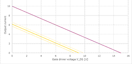 但是實(shí)際中,無論是處于EMI的考量還是為了保護(hù)續(xù)流二極管,必然會(huì)使用門極電阻,而且為了功率門極不處于欠阻尼狀態(tài),Rg≥√(L⁄C)。為了分析方便,我們先不考慮門極回路里的電感且把驅(qū)動(dòng)內(nèi)部的MOS當(dāng)作一個(gè)可變電阻處理,那么如圖5,可以求出ig=(VCC-VDS-Vge)/Rg,用圖4的坐標(biāo)形式的話,將會(huì)是一系列平行的斜線,如圖6。斜率和電阻值相關(guān),比如圖中的電阻是1.5Ω。門極電壓每充1V,斜線就沿橫坐標(biāo)往左平移1V。把圖4和圖6結(jié)合在一起得到了圖7,交點(diǎn)就是實(shí)際輸出的峰值電流,由于實(shí)際電路中肯定還有寄生電感,會(huì)限制到達(dá)峰值電流的速度,導(dǎo)致真實(shí)電流值更小。對于一般的中小功率而言,1.5Ω的門極電阻算小的了,理想無感的交點(diǎn)在6A。如果門極電阻再大些,交點(diǎn)電流將更低。這樣輸出電流的能力被電阻限制住了。所以英飛凌宣稱的6A并不是15V時(shí)對應(yīng)的電流值,而是考慮在功率器件標(biāo)稱電流對應(yīng)的米勒平臺(tái)時(shí)的電流能力。如果直接從橫坐標(biāo)15V的地方找對應(yīng)的電流甚至大于10A了。