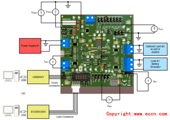 圖6. 評估板BQ25792/8EVM測試電池充電建立圖