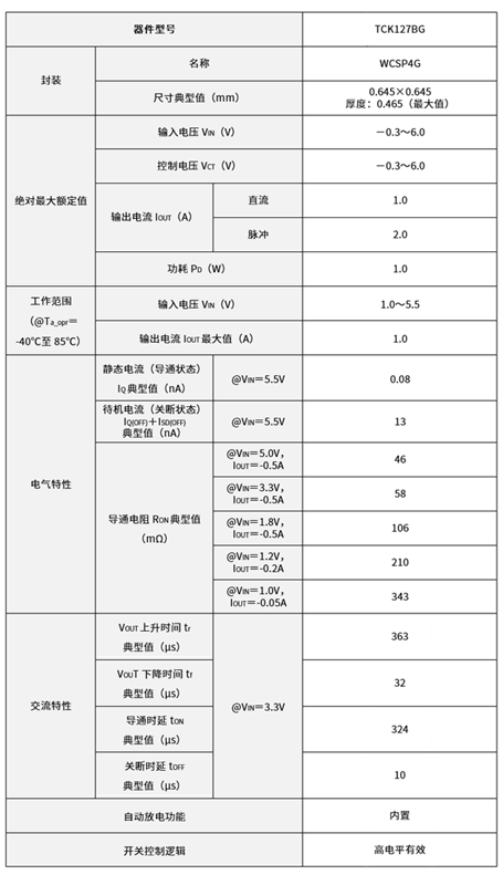 TCK127BG負(fù)載開關(guān)支持在1V至5.5V寬電壓范圍內(nèi)工作,具有高達(dá)1A的輸出電流,十分適用于負(fù)載在1A以內(nèi),要求寬電壓工作的產(chǎn)品;