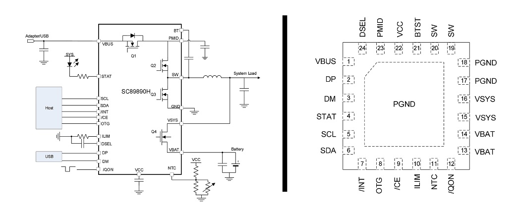據(jù)了解,南芯SC89890H采用QFN 4×4-24封裝,輸入端支持高達22V耐壓。芯片集成了反向阻斷管(RBFET)、降壓功率管(HSFET及LSFET)、功率路徑管理管(BATFET)、功率管驅動供電及自舉二極管,可在應用是大幅度簡化了系統(tǒng)設計。南芯SC89890H支持高達5A充電電流以及2.4A反向OTG電流,并且充電參數(shù)可通過I²C接口由手機處理器靈活配置。
