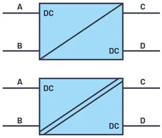 電路設(shè)計人員通常將電源視為黑盒子或4極元件。其具有兩個輸入線路和兩個輸出線路。圖1所示為DC-DC轉(zhuǎn)換器的框圖符號。頂部是非電氣隔離式DC-DC轉(zhuǎn)換器,底部是電氣隔離式轉(zhuǎn)換器。