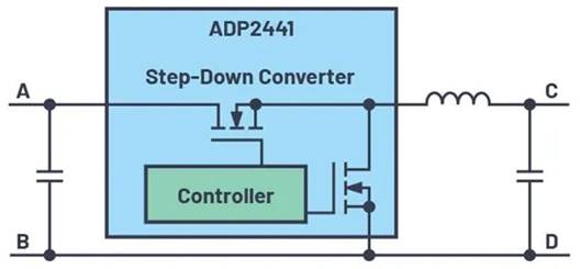 圖1中未體現(xiàn)端子的噪聲特性。不同的開關(guān)穩(wěn)壓器拓?fù)湓?端口網(wǎng)絡(luò)端子處具有不同的噪聲特性。圖2顯示適合工業(yè)應(yīng)用的ADP2441通用降壓轉(zhuǎn)換器。它可以將24 V輸入電壓轉(zhuǎn)換為3.3V輸出電壓。采用這種拓?fù)鋾r,可以看出,輸入側(cè)會產(chǎn)生脈沖電流,因此噪聲很大。當(dāng)ADP2441上的高端開關(guān)導(dǎo)通時,電流流入端子A。當(dāng)此開關(guān)關(guān)斷時,沒有電流流經(jīng)節(jié)點A。但是,輸出端C的噪聲很小。其中,輸出路徑中的電感可確保輸出端沒有脈沖電流。