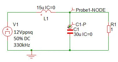 頻率。LC 濾波器由一個 15µH 電感器和一個為 1Ω 負載供電的 30µF 電容器組成。