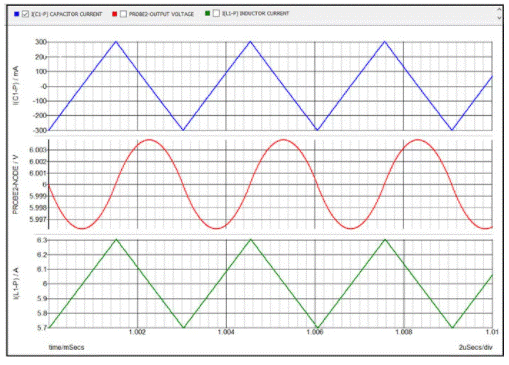 電路用Simplis 仿真,主要波形如圖2所示。藍色波形是以零為中心的 +/-300mA 峰峰值的三角電容器電流。紅色波形是以 6V