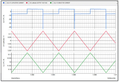 6V 的輸出電壓。輸出電壓、電感器和電容器值與上述降壓轉換器的情況相同。在這兩種情況下,相同的 LC 無源器件將 6V 提供給 1Ω。