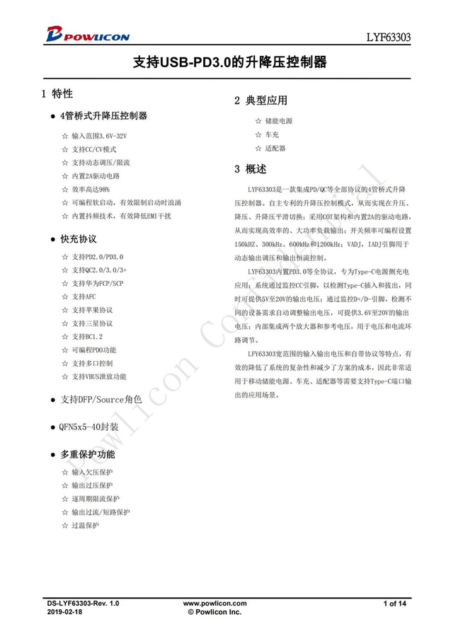 LYF63303 內(nèi)置PD3.0等全協(xié)議,專為Type-C電源側(cè)充電應(yīng)用;系統(tǒng)通過監(jiān)控CC引腳,以檢測Type-C插入和拔出,同時可提供5V至20V的輸出電壓:通過監(jiān)控D+/D-引腳,檢測不同的設(shè)備需求自動調(diào)整輸出電壓,可提供3.6V至20V的輸出電壓;內(nèi)部集成兩個放大器和參考電壓,用于電壓和電流環(huán)路調(diào)節(jié)。