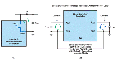 圖1. (A) 異步單芯片升壓轉(zhuǎn)換器具有單個熱回路,其中包含一個外部續(xù)流二極管。(b) Silent