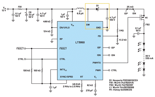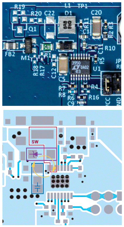 LT3950 LED驅(qū)動器是一個異步單芯片1.5 A、60 V升壓轉(zhuǎn)換器。升壓轉(zhuǎn)換器熱回路(黃色突出顯示)包含一個分立式續(xù)流二極管,不會減弱高頻率輻射。