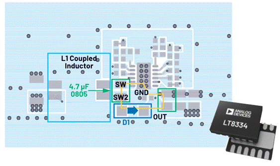 (EVAL-LT8334-AZ)的熱回路布局中包含這個微型DFN、一個陶瓷耦合電容、一個陶瓷輸出電容和一個小型續(xù)流二極管。