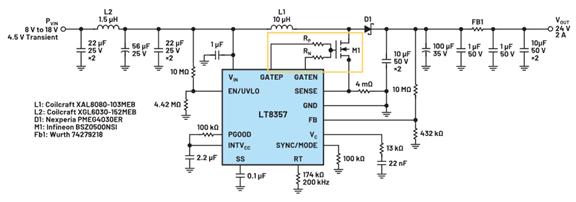 LT8334異步升壓轉(zhuǎn)換器中包含一個集成式5 A、40 V開關(guān)。這個單芯片升壓轉(zhuǎn)換器IC適合用于構(gòu)建12 V輸出SEPIC轉(zhuǎn)換器。圖4顯示標(biāo)準(zhǔn)型12