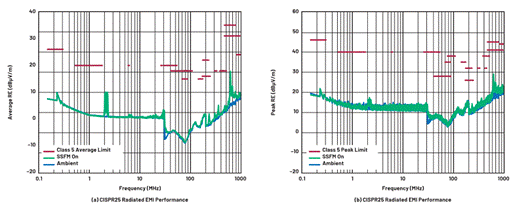 圖10. DC2788A LT3950通過了(a)平均和(b)峰值CISPR 25