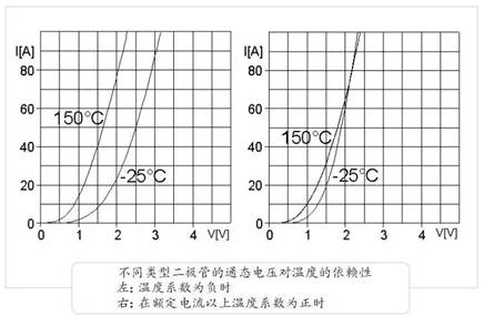 判斷一個(gè)二極管是否適合并聯(lián)的重要參數(shù)是其通態(tài)電壓對(duì)溫度的依賴性。如果通態(tài)電壓隨溫度的增加而下降,則它具有負(fù)的溫度系數(shù)。對(duì)于損耗來(lái)說(shuō),這是一個(gè)優(yōu)點(diǎn)。