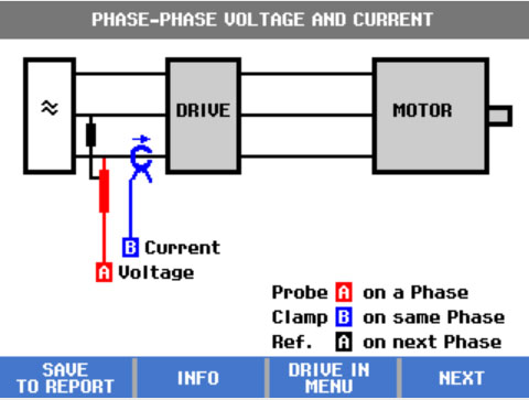 要使用 Fluke Motor Drive Analyzer 開始每個(gè)測試,只需根據(jù)圖表連接測試探針,然后按“下一步”。