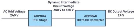 用于功率補償?shù)墓β室驍?shù)校正(PFC)級,可將電網(wǎng)電壓的交流電壓提升至直流中間電路電壓。在240 V交流系統(tǒng)中,這種中間電路電壓一般為380 V,如圖1所示。ADP1047  PFC控制器可以使用DVS,在不影響設定的380 V電壓的情況下獨立降低輸出電壓負載,例如,降低至360 V。在采用部分負載運行期間,此舉可以提高電源的轉(zhuǎn)換效率。
