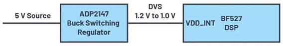 另一個DVS使用示例如圖2所示。在此示例中,ADP2147 降壓型開關(guān)穩(wěn)壓器為數(shù)字信號處理器(DSP)供電。在許多應用中,都可以使用微控制器、DSP或FPGA來提高系統(tǒng)效率,方法是:在處理器處于待機模式時降低內(nèi)核電壓。在VDD_INT電壓(內(nèi)核電壓)降低(例如,在DSP在低負載狀態(tài)下運行時,從1.2 V降低至1.0 V)時,多種DSP,包括ADI提供的ADSP-BF527 都可以更高效地運行。處理器的功耗在很大程度上與其時鐘頻率和工作電壓的平方成比例。將ADSP-BF527的電源電壓降低25%,動態(tài)功耗會降低超過40%。ADI的許多DSP都具有類似特性。