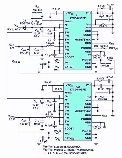 圖1. 5 V輸出轉(zhuǎn)換器(U1)為3.3 V輸出(U2)上的受保護(hù)負(fù)載供應(yīng)保持電源。請(qǐng)注意,U1的引腳MODE/SYNC將懸空,以允許LTC3649進(jìn)入升壓模式。