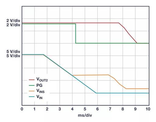 圖2. 當(dāng)輸入電壓 VIN下降時(shí),轉(zhuǎn)換器U1對(duì) VOUT1 進(jìn)行升壓以將 VINS維持在8 V。在 VINS降壓后,VIN 供電以使 VOUT2 保持穩(wěn)定超過20 ms。