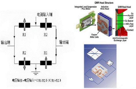 巨磁電阻傳感器將四個(gè)巨磁電阻構(gòu)成惠斯登電橋結(jié)構(gòu),該結(jié)構(gòu)可以減少外界環(huán)境對(duì)傳感器輸出穩(wěn)定性的影響,增加傳感器靈敏度。