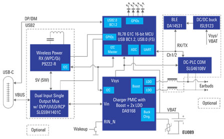方案中使用的PMIC是瑞薩旗下可配置的單芯片電源管理IC DA9168,其集成的雙LDO和反向升壓功能,可支持USB On-The-Go(USB-OTG)標(biāo)準(zhǔn)。此外,該P(yáng)MIC芯片在非常緊湊的體積內(nèi)實(shí)現(xiàn)了極低的靜態(tài)電流消耗,這使其非常適用于眾多注重空間的、電池供電的消費(fèi)類應(yīng)用。不僅如此,得益于DA9168的多種省電模式,使得產(chǎn)品無論是閑置存放還是在運(yùn)行中,都可以延長電池壽命。在供電設(shè)計(jì)方面,方案可通過USB連接器或單芯片5W無線電源接收器(P9222-R)為該P(yáng)MIC供電。供電路徑由2:1電源多路復(fù)用器(SLG591401C)自動選擇。