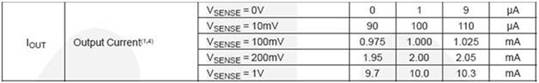 其中Vin為輸入電壓,Iout_fs的值則是表1中的對(duì)應(yīng)值,在不同的最大Vsense時(shí),其值不一樣。例如,若最大的Vsense為500mV時(shí),則Iout_fs=5mA。